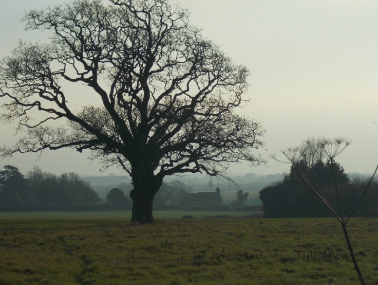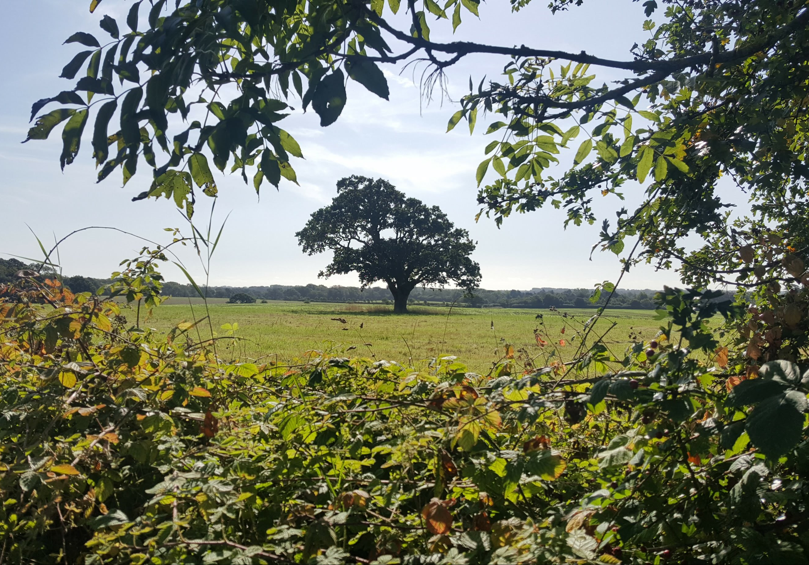 Now pause, and leave the paved road. A signpost shows a way towards woods. Scotland Lane. Before the woods are fields and there, looking across a gently sloping landscape, is a lone Oak: the Sentinel.