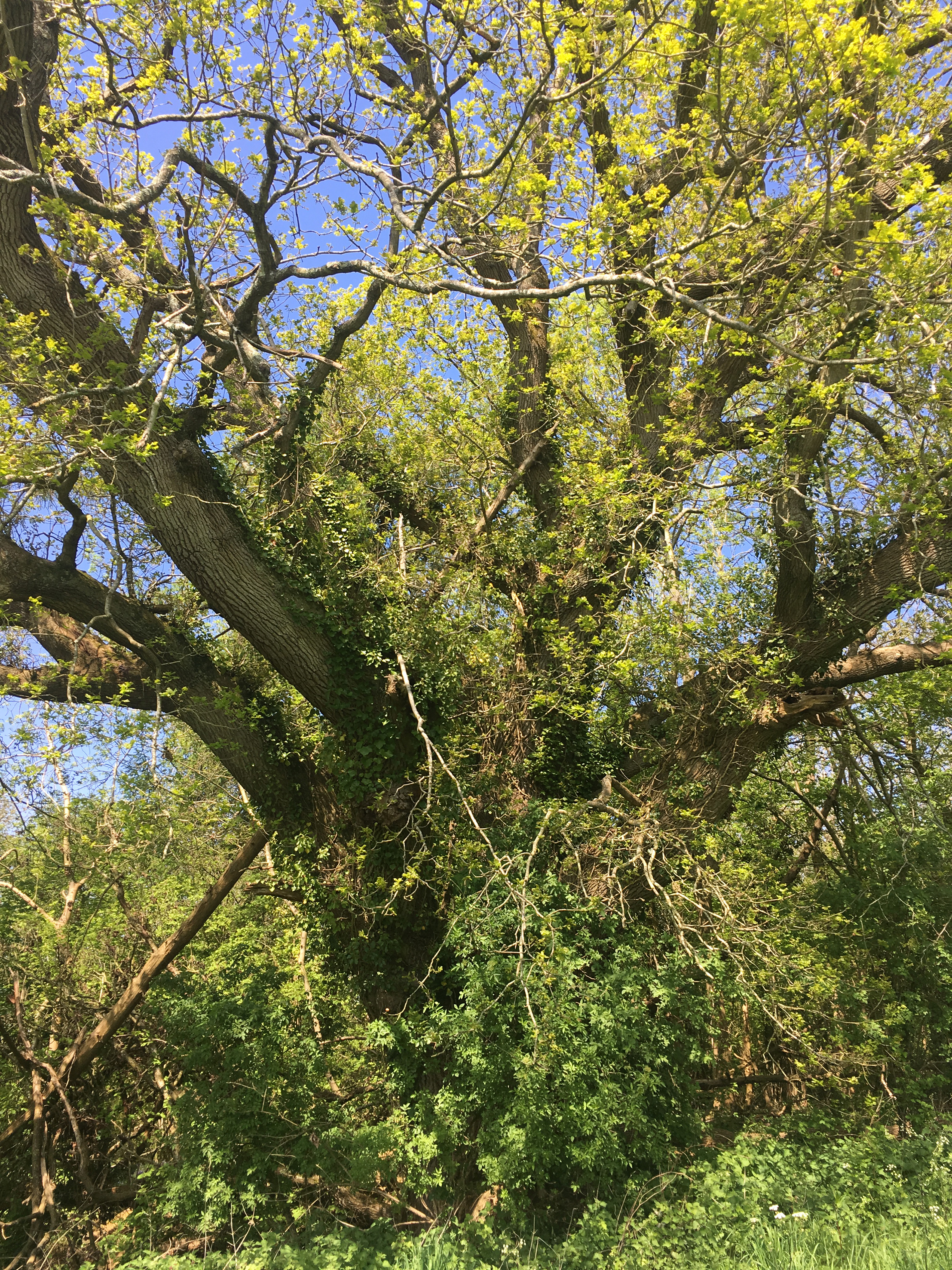 You would be forgiven for feeling it was always this way. But the Oak’s trunk-like lower branches tell a story. Head-height, they are evidence of pollarding – long ago, the tree was cut to provide regrowth out of reach of grazing animals. Before it was turned to parkland, then, this was common land.